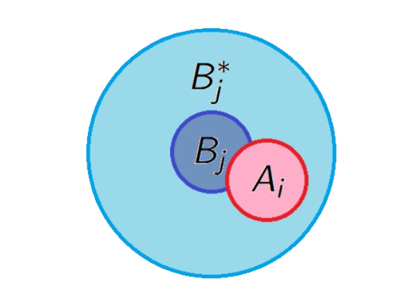 • Hence \[{\color{red}A_i \subseteq B_j^{*}},\] where \(B_j^*\) is the ball concentric with \(B_j\) whose radius is three times that of \(B_j\). In other words, \({\color{red}B_j^*=3B_j}\).